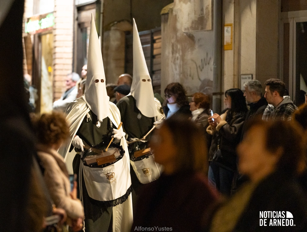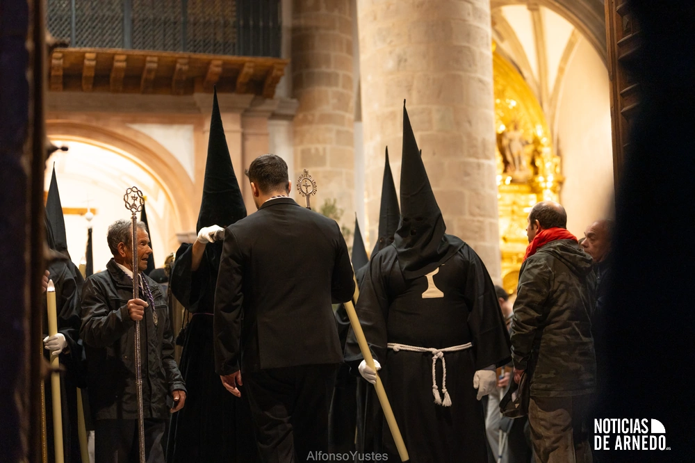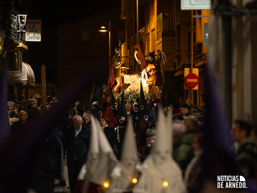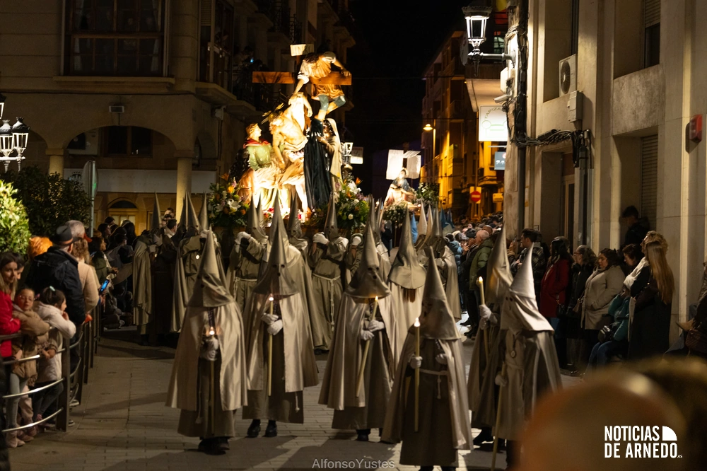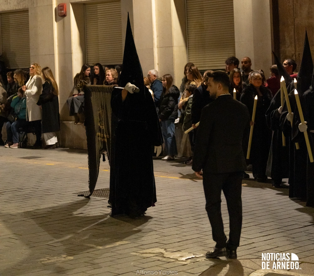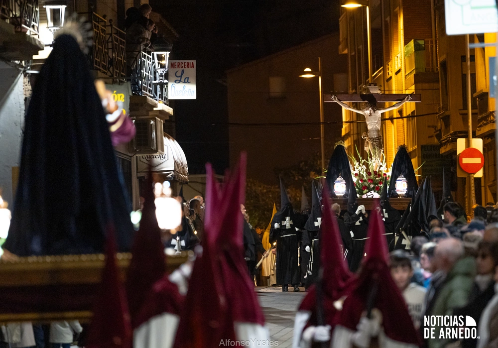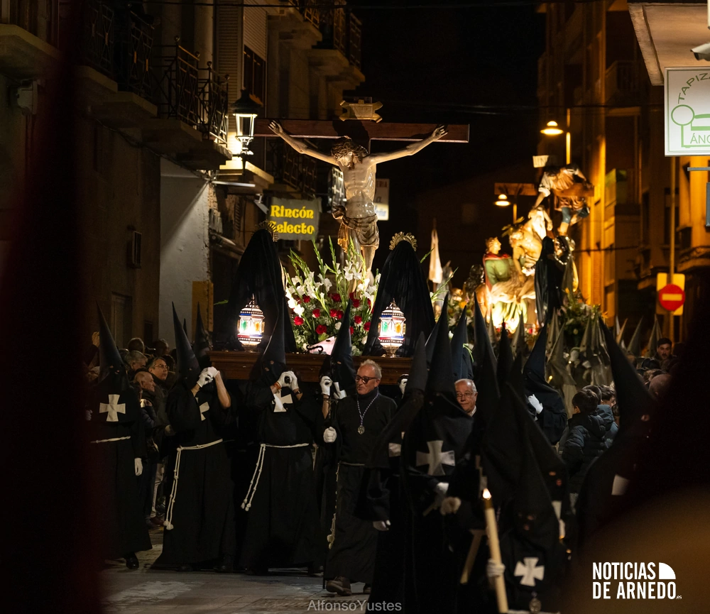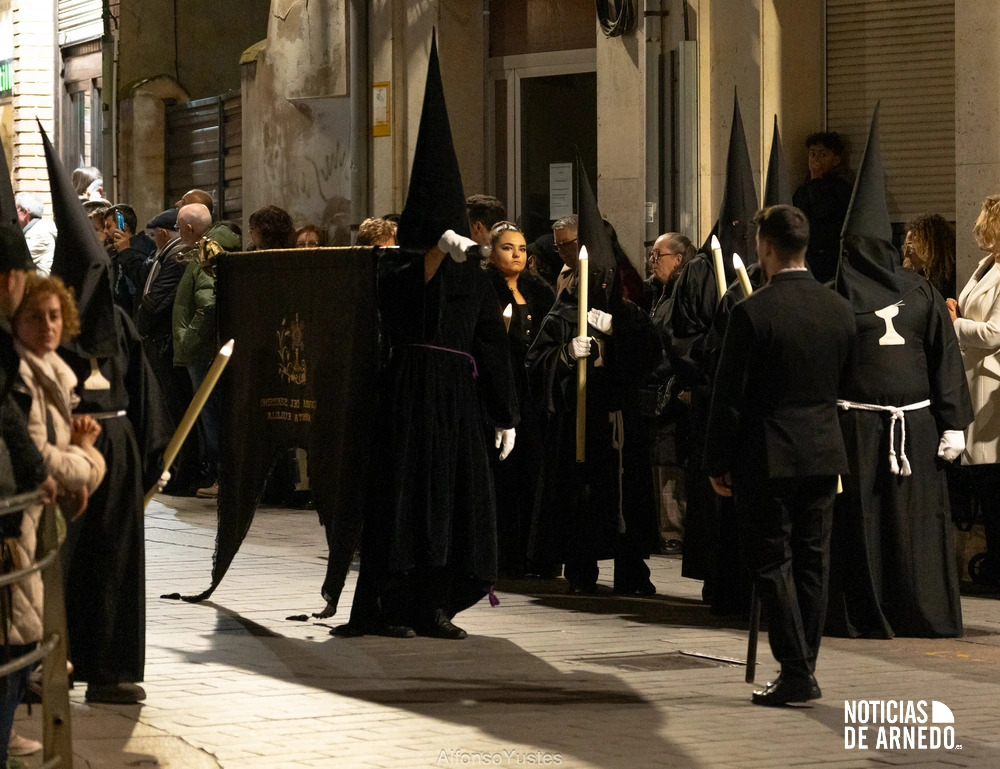 La Procesión del Silencio recorrió en la noche del Viernes Santo las calles del Arnedo en una de las estampas más solemnes de la Semana Santa 2026. La procesión partió a las 21:00 horas desde la iglesia de San Cosme y San Damián y siguió su recorrido habitual por la calle San Cosme, calle Mayor, Picota, plaza Nuestra Señora de Vico y calle Preciados, antes de regresar al templo. Organizada por la Cofradía de la Santa Vera Cruz en colaboración con la Parroquia y el Ayuntamiento de Arnedo, tal y como reflejan las imágenes captadas por Alfonso Yustes, colaborador de Noticias de Arnedo.