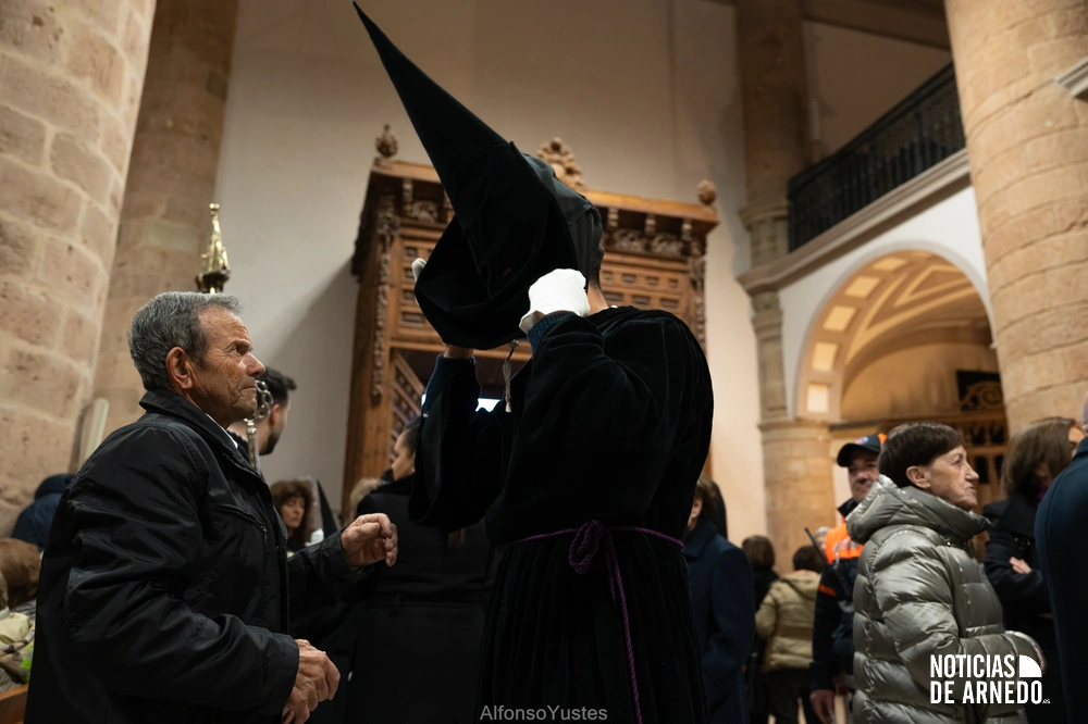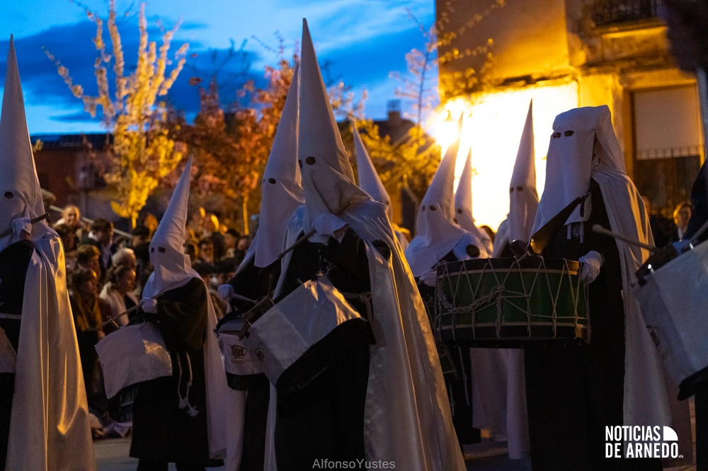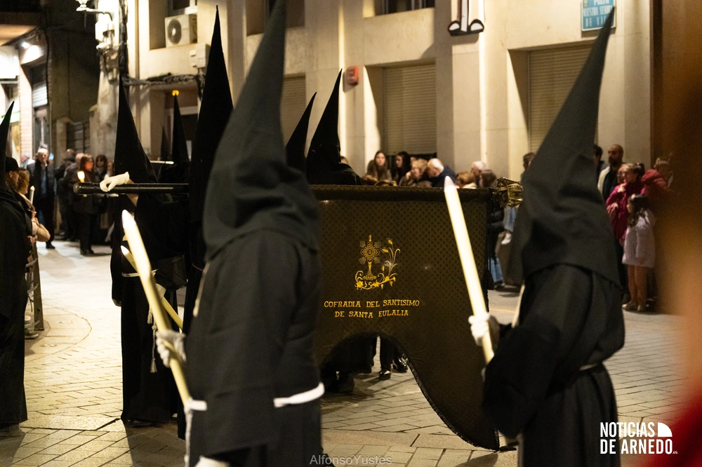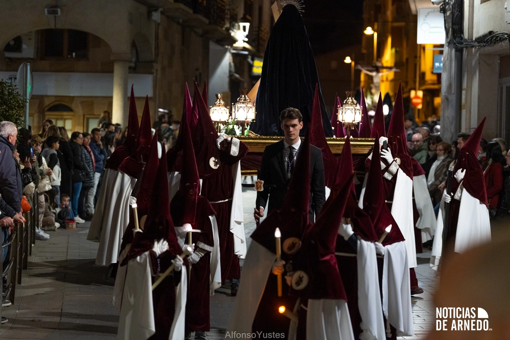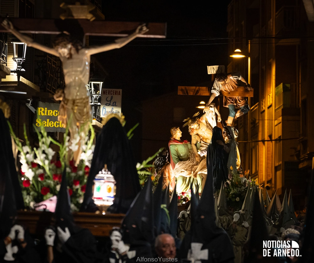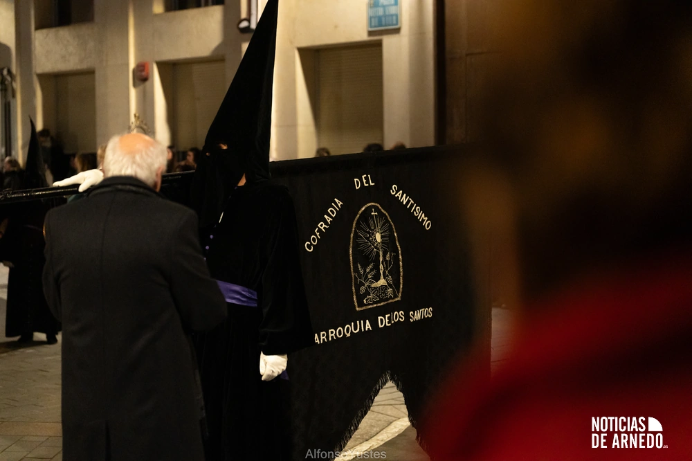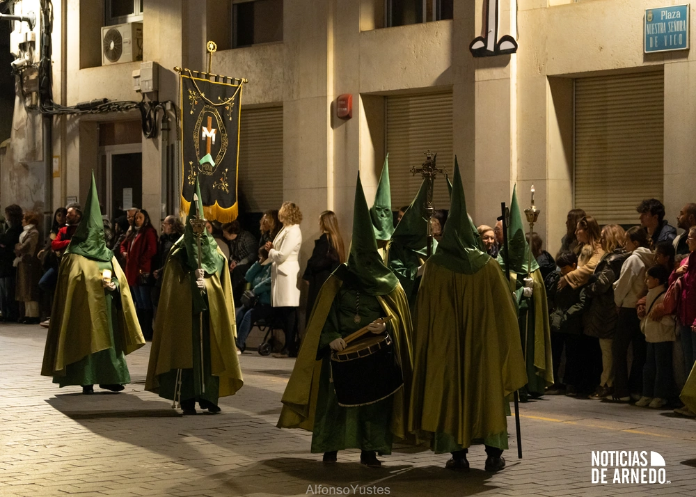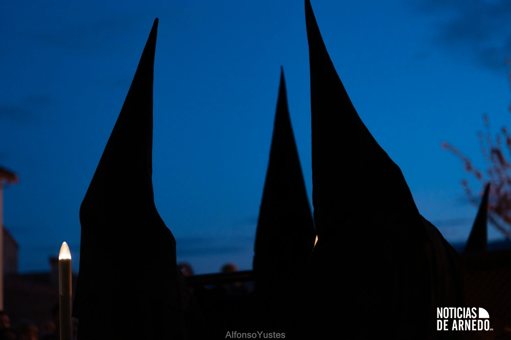 La Procesión del Silencio recorrió en la noche del Viernes Santo las calles del Arnedo en una de las estampas más solemnes de la Semana Santa 2026. La procesión partió a las 21:00 horas desde la iglesia de San Cosme y San Damián y siguió su recorrido habitual por la calle San Cosme, calle Mayor, Picota, plaza Nuestra Señora de Vico y calle Preciados, antes de regresar al templo. Organizada por la Cofradía de la Santa Vera Cruz en colaboración con la Parroquia y el Ayuntamiento de Arnedo, tal y como reflejan las imágenes captadas por Alfonso Yustes, colaborador de Noticias de Arnedo.